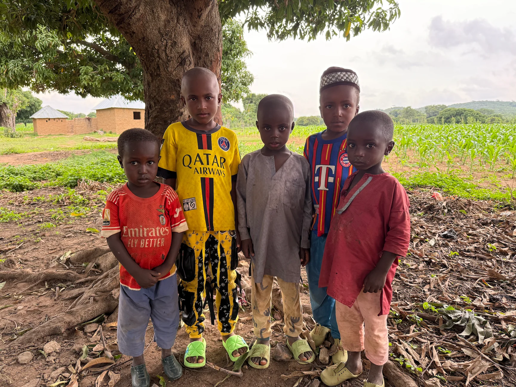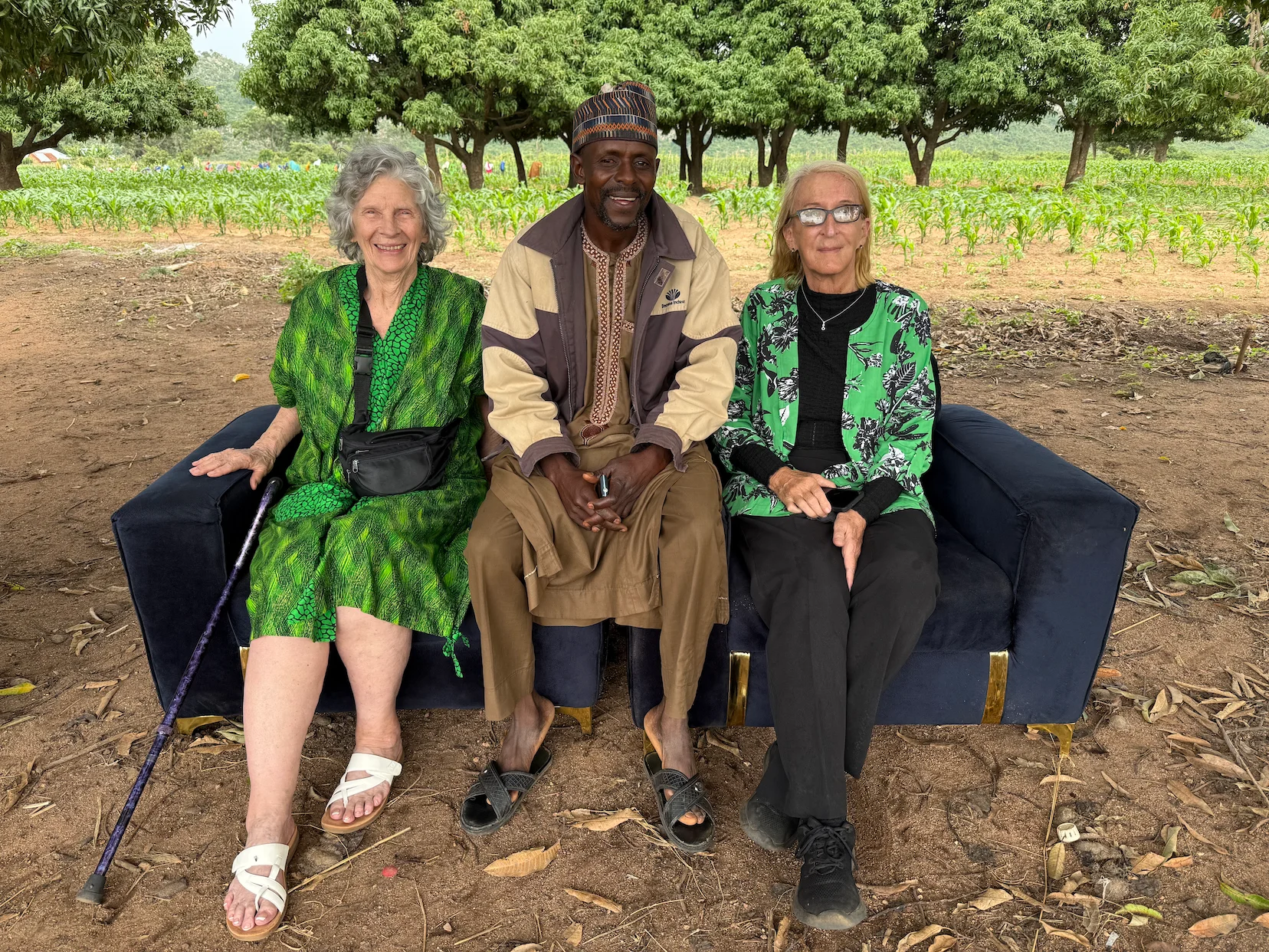 After an hour of driving horrible roads through the bush way way out, we pull under the shade of a large nut tree, looking out over a field of corn. Across the field is the beautiful village of Ardo's brother Usman, made of cement block homes and huts. We trek down the trail through the corn, and are escorted to the shade in a stand of trees. They pull out Chief Usman's thrones for our 'mommies', Phyllis and Carol, to sit on - what honor they show us! They bring us a treat - a bottle of Maltina, my favorite soda, and bottled water!
