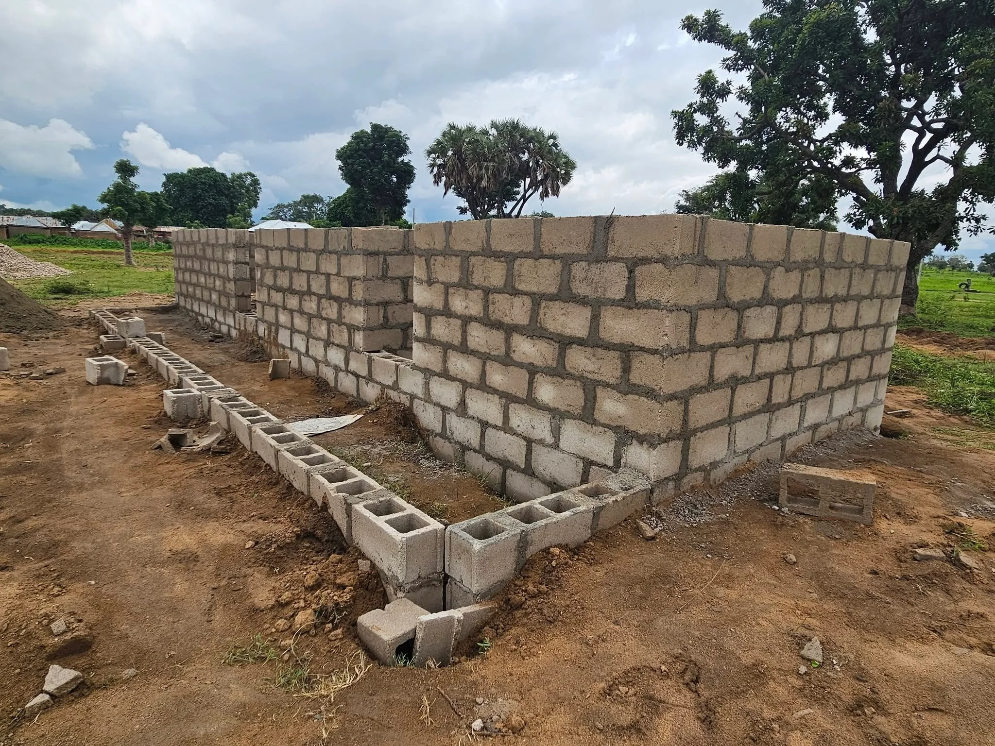 Phyllis hired laborers to build block on site. Foundations were poured in concrete, and the blocks were already placed for the clinic building! Work on the clinic roof has begun!