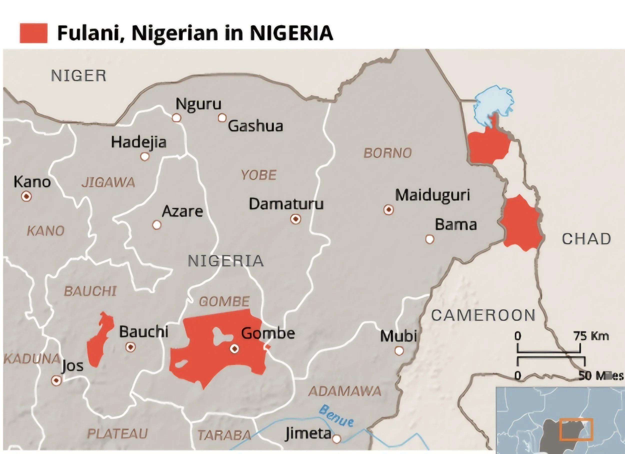 The red portions on the map above represent the highest concentrations of Fulani people in Nigeria. Find JOS on the map and BAUCHI. Bauchi is the capital city of Bauchi State. We are building this very large primary school in Mungyar Village, within the red zone of Bauchi.