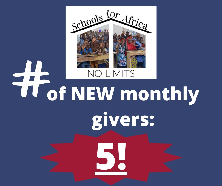 We need to increase monthly giving by $6,000/mth to cover the 7 new schools we took on in June!