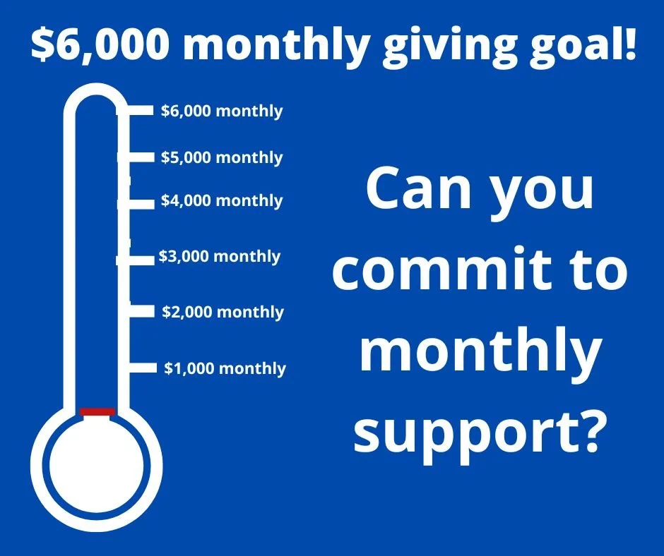 A generous donor has offered a HUGE matching challenge for NEW monthly givers! This means that your NEW recurring monthly gift is DOUBLED through the end of the year!