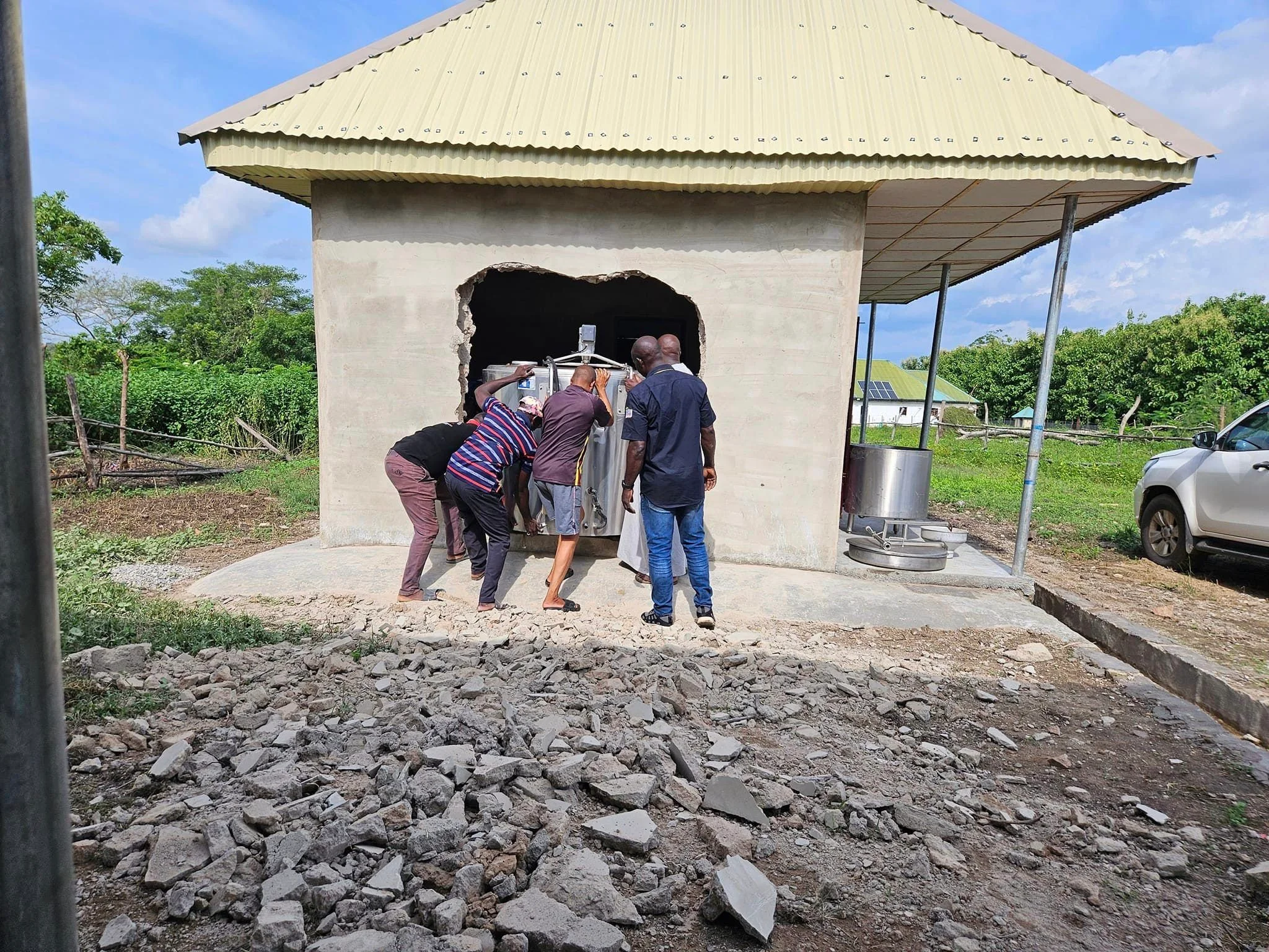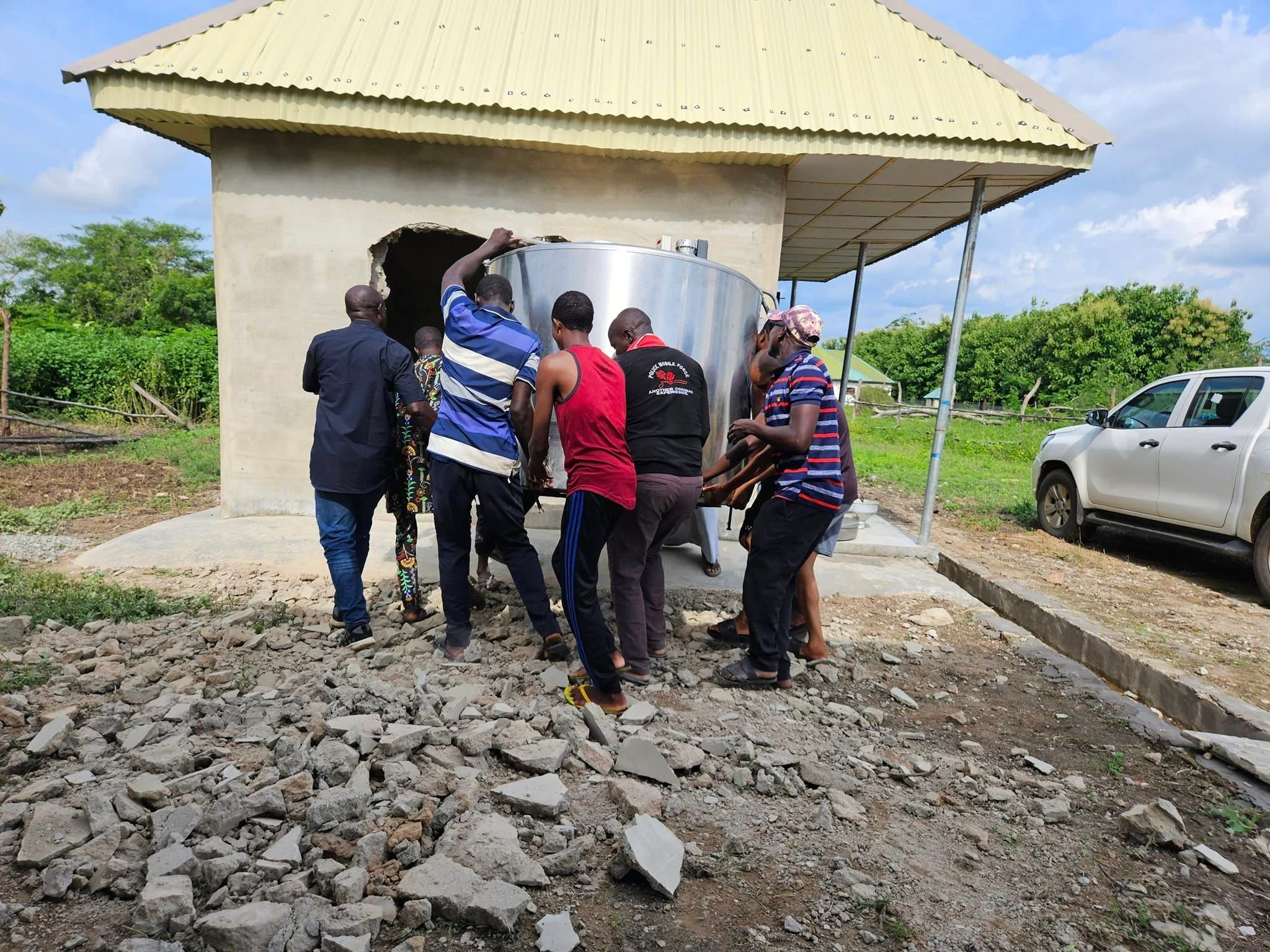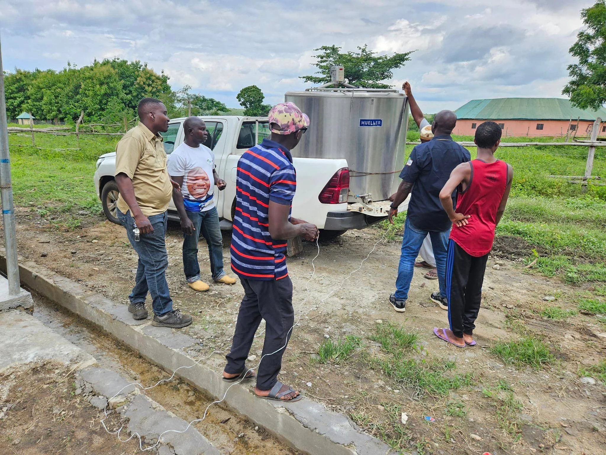 Yippee! The Friesland Campina Peak Milk people came with the large refrigeration tank... which didn't fit into the double door we had prepared for it! No problem, we made another door!! We will fill in the wall, tile the floor, they will come back with the generator and the milk collection project will be underway! Friesland Campina will buy milk from the Fulani at a good price.